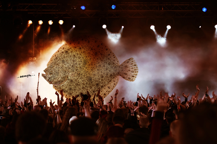 GRONINGEN A giant turbot fish took the stage at what was supposed to be a quiet seafood cocktail party at town hall last friday. The room had just filled with anxiety riddled party people awaiting a sceduled disappearing act by internationally acclaimed magician Red Herring. Surprised, some stunned, they instead witnessed the turbot walking on. Pausing at the microphone stage left, he monotonously announced de fuckups’ work-in-progress setlist. Allthough this was executed without further introduction, and the crowd had innitially agreed to the remark about the lights on these tables for being ‘spot on’, they roared with enthusiasm as soon as he got to ‘Oomph’. A sneaky eel and a red-with-anger lobster later told they had called him a superficial squealer after he had unfolded his plans, regretfully to no avail. The list: